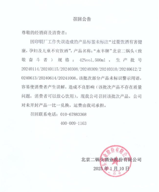 此外,涉案产物的检测演讲证明产物无质量问题。曾经启动大面积召回法式,后续出产批次的产物不存正在雷同问题。二锅头相关部分工做人员回应记者!