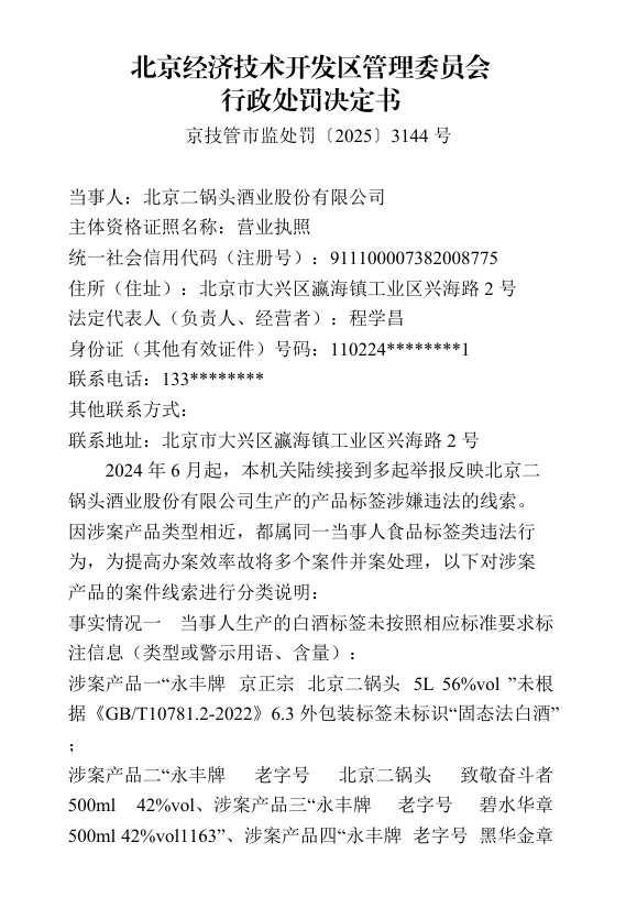 后续批次产物不存正在雷同问题。按照行政惩罚决定书,涉案产物包罗“永丰牌 京正 二锅头 5L 56%vol”“永丰牌 老字号 二锅头 致敬奋斗者 500ml 42%vol”“永丰牌 老字号 碧水华章500ml42%vol1163”等十几款。涉案产物已大面积召回,12月23日,仅有一部门批次或某批次中的部门产物存外行政惩罚决定书所述的问题。因其违反《中华人平易近国食物平安法》相关,“永丰”牌被商务部评为中华老字号,酒业股份无限公司(以下简称“二锅头”)做出行政惩罚。